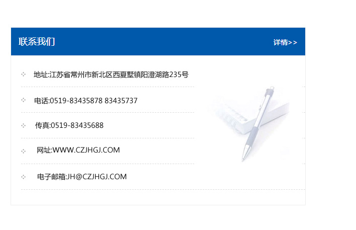 地址:常州市新北區友邦商務大廈1幢16、17層  電話:0519-85101652  傳真:0519-85112595  郵編:213022  網址:www_cz-jiayue_cn.hljbolaide.com  郵箱:xiajifengaa@163.com